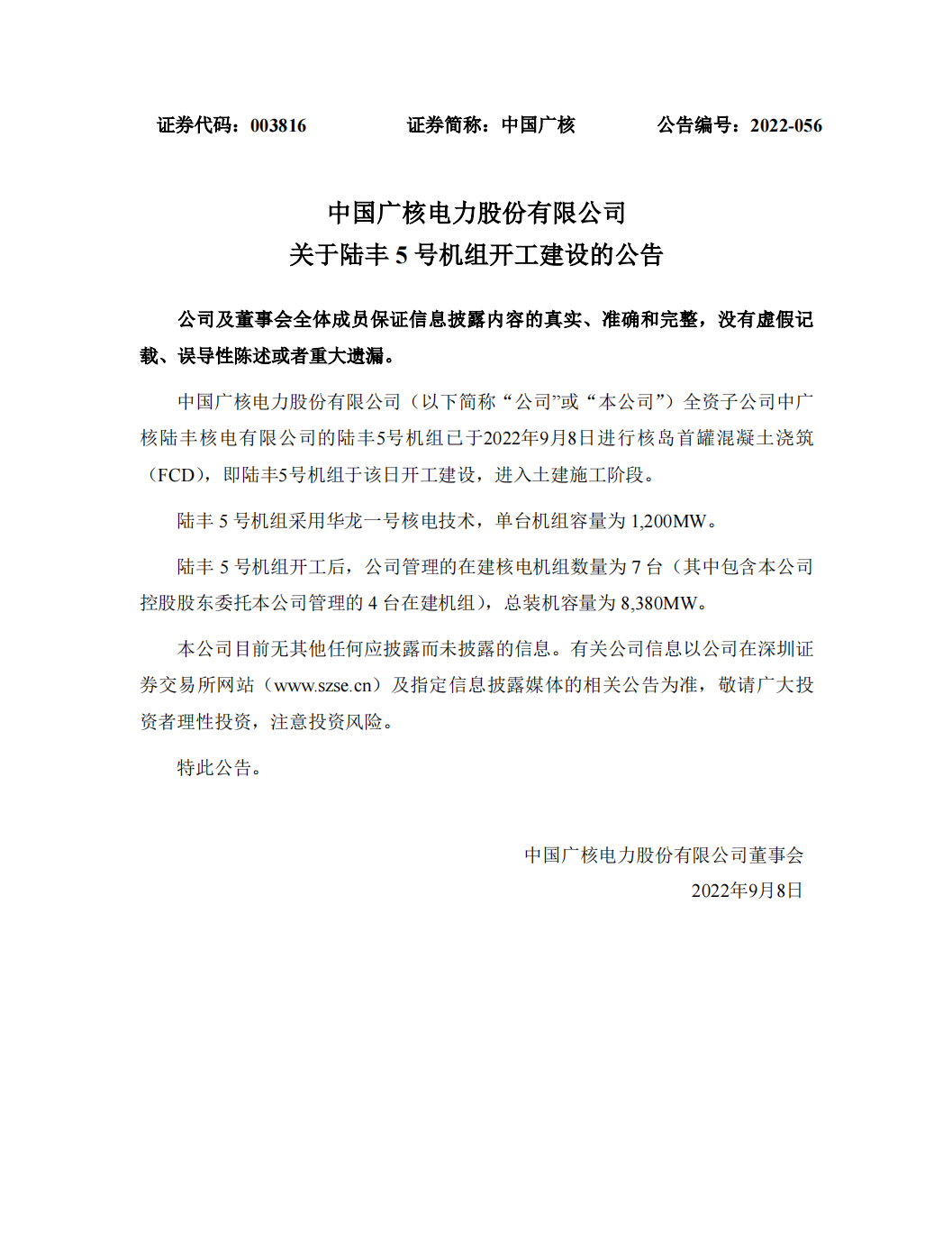 9月8日,中国广核公告称,全资子公司中广核陆丰核电有限公司的陆丰5号机组已于2022年9月8日进行核岛首罐混凝土浇筑(FCD),即陆丰5号机组于该日开工建设,进入土建施工阶段。