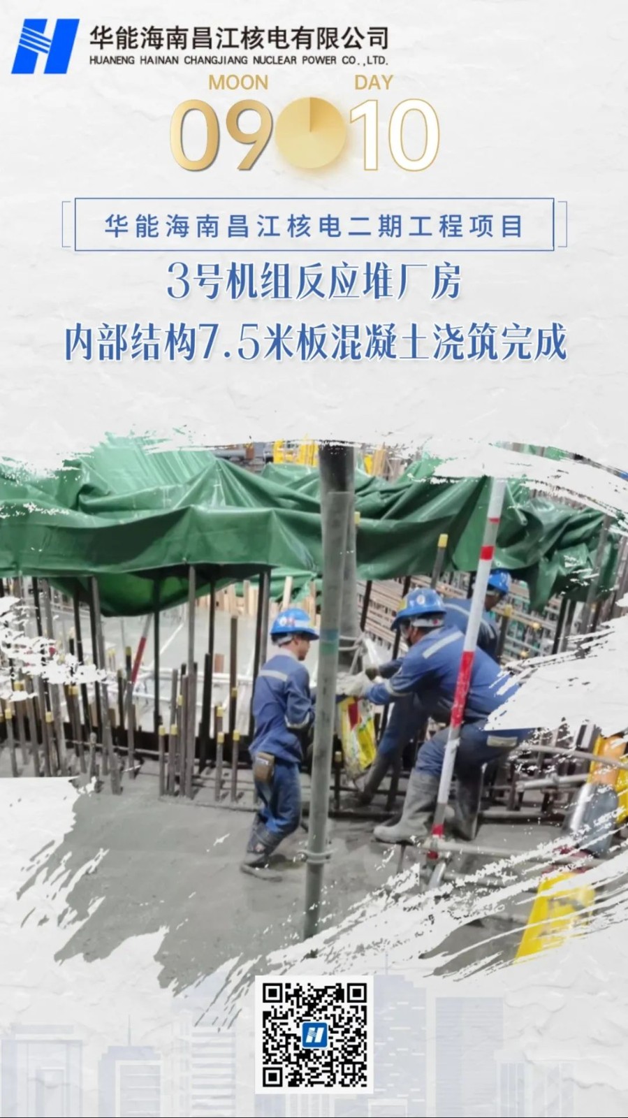 2022年,华能海南昌江核电3号机组反应堆厂房内部结构7.5米板混凝土浇筑完成,本层楼板分8段施工,共浇筑混凝土670立方米,持续浇筑时长30小时。本次浇筑完成后标志着3号机组反应堆厂房7.5米板圆满完成。