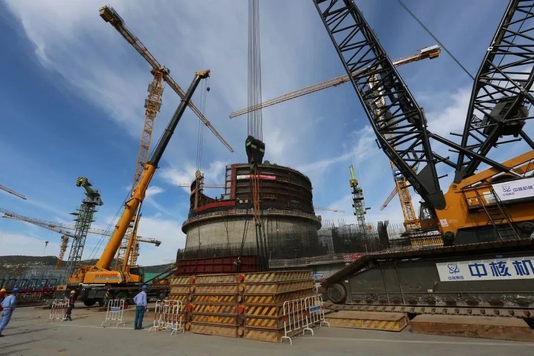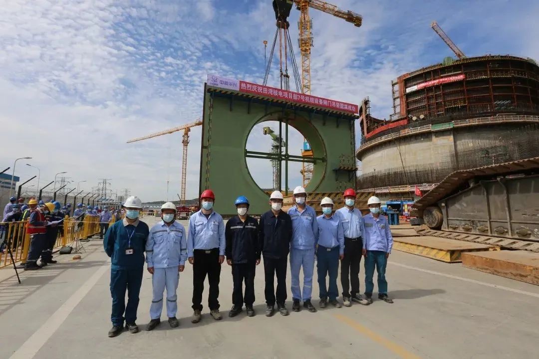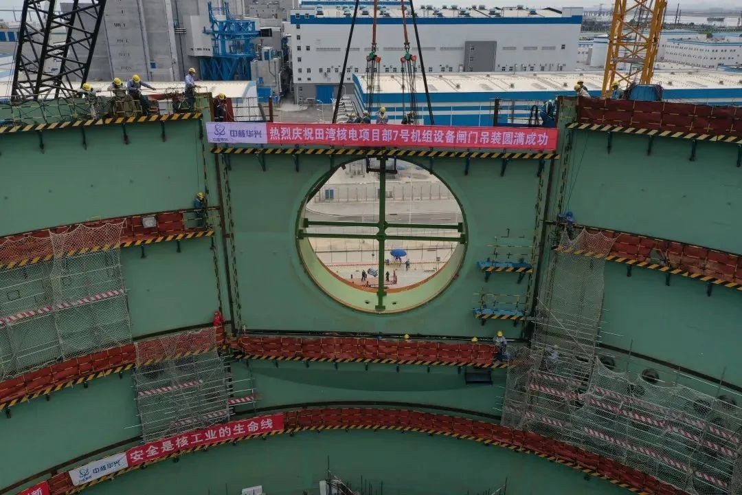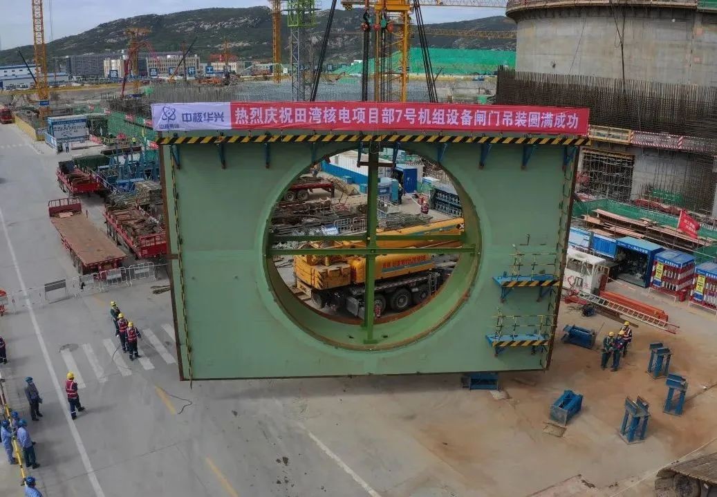 9月9日,中国核建成员单位中核华兴、中核机械工程负责施工的田湾核电7号机组安全壳钢衬里设备闸门套筒模块顺利吊装就位。