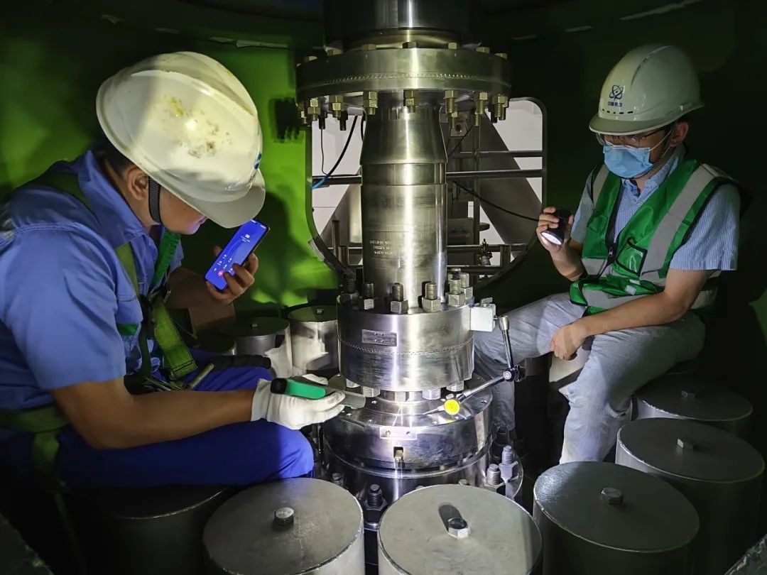 主泵全流量试验通过模拟各种苛刻工况全面验证主泵极限运行性能,2000余个零件的组装精度直接关系运行表现,突击队在高标准完成泵芯和电机安装的基础上,坚持精益求精,反复优化,又经过3昼夜的调整验证,将8.4米长的轴系的径向跳动由要求值0.05mm降低至0.025mm以内,超标准完成轴系对中,确保厂内试验将顺利开始。