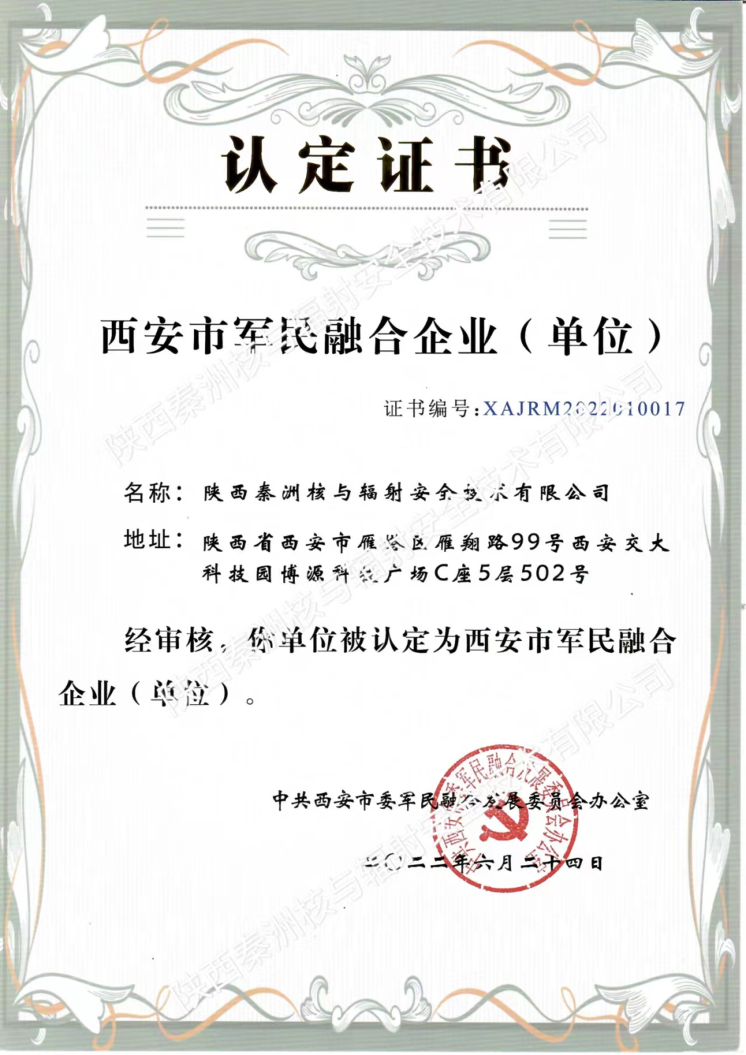 近日,西安市委军民融合发展委员会公布了西安市2022年第一批军民融合企业(单位)名单,中陕核集团核盛公司的控股子公司——陕西秦洲核与辐射安全技术有限公司(以下简称“秦洲公司”)被认定符合军工产品配套类企业认定标准,列入2022年西安市军民融合企业。