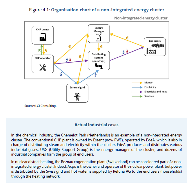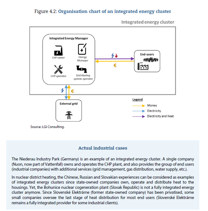 相对于现有核电厂,核能热电联产厂的建设融资将面临更大的挑战,因为其要面对更多的干系人。核能热电联产厂需要面对两个市场:电力和热能(或工业产品)。在大多数国家,电网的分布比供热网络更为广阔。相对于需要建设专门的基础设施以将热能输送给新用户,将电力输送给用户的成本可以忽略不计。确定核能热电联产厂细分目标市场的一个最重要参数的温度。其他重要参数包括所需的热量、特定安全要求、适应负载瞬变的能力、运行可靠性、传热技术限制,以及(非常重要的)核反应堆与热电联产设施的取证程序。从技术上讲,核能热电联产厂可以采用两种系统集成技术:一是电力或连续耦合系统,即核反应堆堆芯能量仅用于发电,然后将电力用于其他用途;二是热耦合系统,即核反应堆堆芯能量用于发电和供热,并满足非电力应用需求。