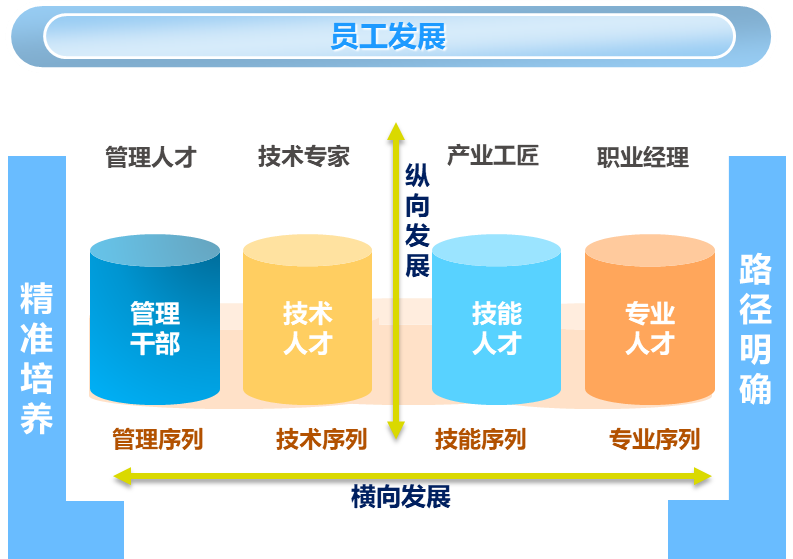 针对科技人员发展路径较为单一、科研技术岗位发展通道不畅等问题,中广核铀业持续深化改革,基于“以岗位为核心”建立“四纵五层”人力资源管理体系。新增技能序列,形成管理、技术、技能、专业四大序列,拓宽了技术员工发展路径。在技术序列增加晋升台阶,在高级和资深之间增设主任高级,鼓励员工不断突破自我,加大公司资深级高端技术人才储备。