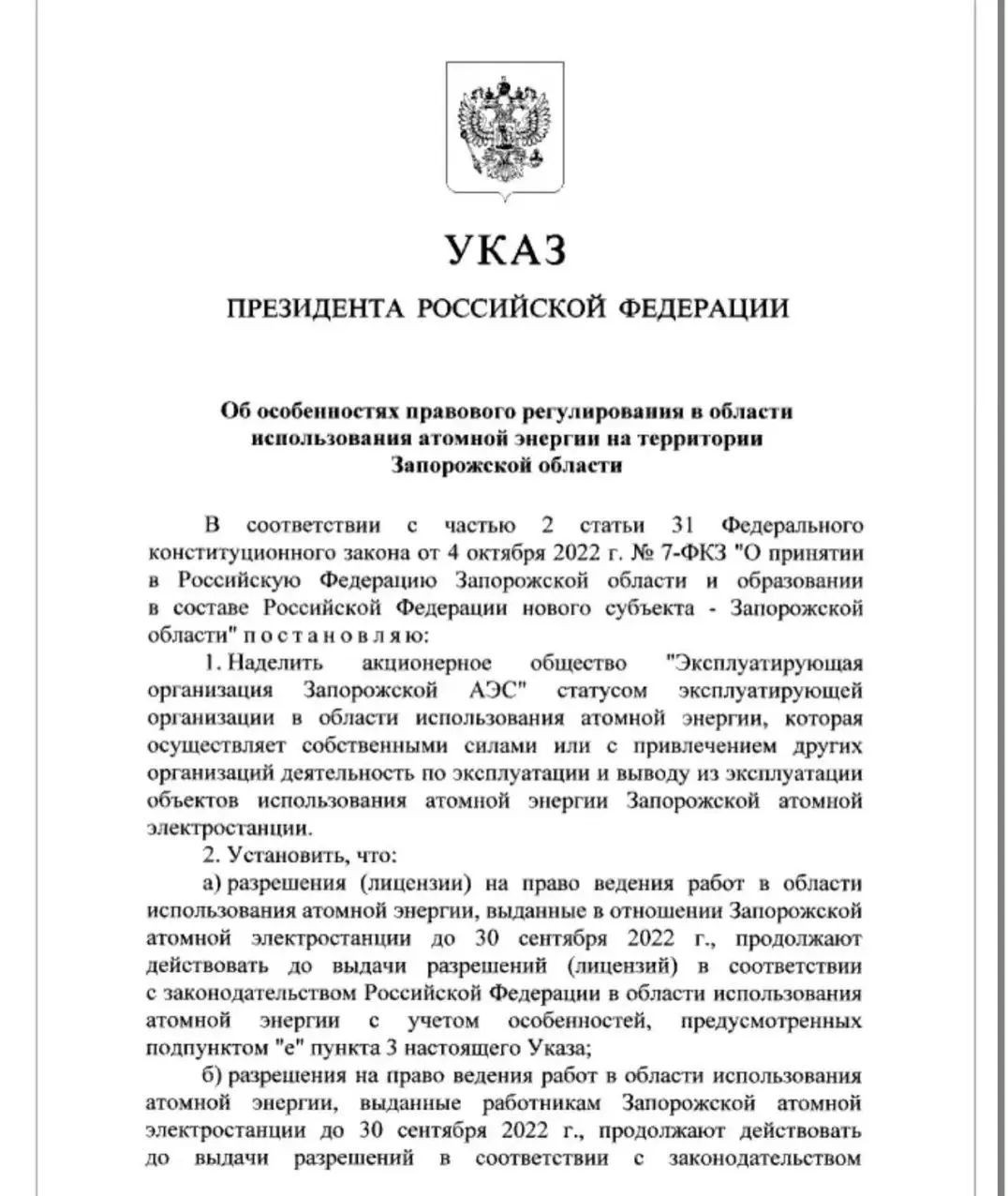 俄罗斯总统普京10月5日签署总统令,规定扎波罗热核电站列入俄罗斯联邦资产。