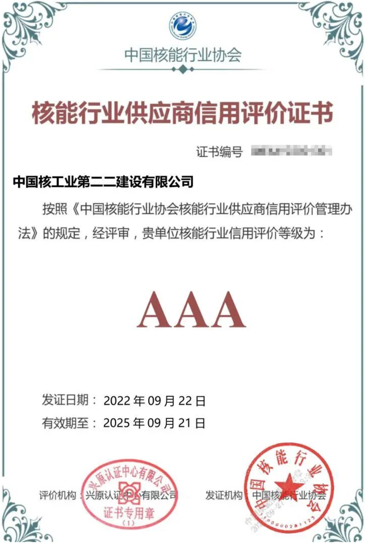 核能行业供应商信用等级级别分为三等五级,AAA级为最高等级。AAA信用评价等级的获得,是对中核二二企业信誉的高度认可,充分体现公司始终坚持“以客户为中心”的经营理念,秉承诚信经营,重视诚信建设所做出的努力和取得的成果,将激励公司在后续经营活动中不断塑造和提升信用形象,以诚信成就更多合作,助推企业高质量发展。