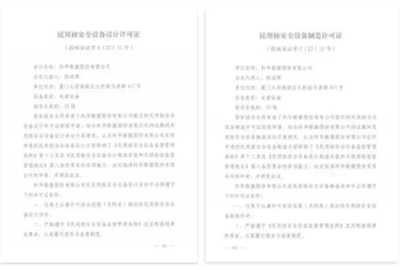 民用核安全设备设计许可证和制造许可证是国内电源行业最高等级的许可证书,是企业进军核电核级市场的通行证,也是企业技术能力和市场竞争力的强有力体现。2017年,科华数据经过申请、并对前期的模拟件设计、制造、型式试验、鉴定试验的过程文件审核及现场答辩和专家评审等重重考验后,成为了业界首批取得民用核安全设备设计和制造许可证的企业。