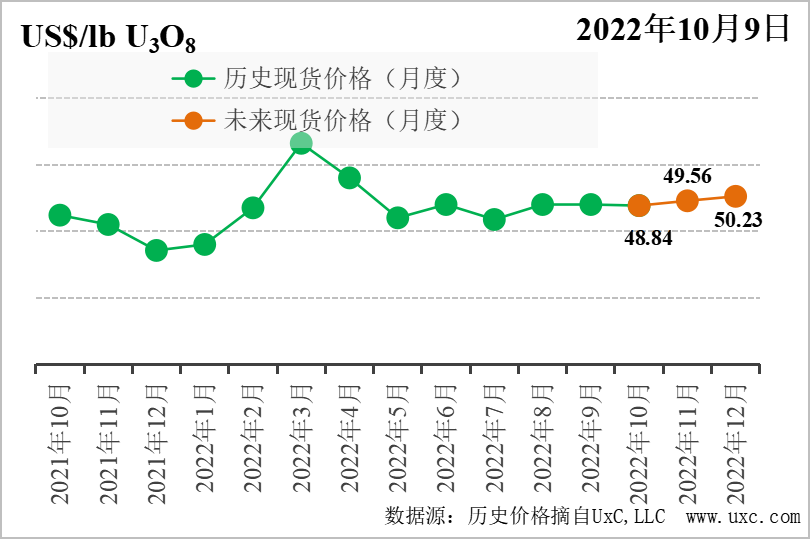 9月,受到美联储加息预期及实际影响,天然铀现货价格呈现波动下降趋势。9月初,在各国积极的核能政策消息支持下,天然铀价格维持在52美元/磅左右。但高位仅维持两周,9月13日,美国公布的CPI指数同比增长高出预期,推高美联储加息可能性,因此带来的资本市场持续波动,9月13日至9月20日,铀价持续下跌至47.5美元/磅。随后小幅回升到50.25美元/磅。9月23日,美联储正式宣布加息75个基点,最后一周,天然铀市场应声持续下跌至48.25美元/磅。