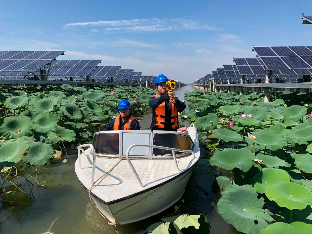 在安徽省马鞍山市当涂县大陇镇双潭湖圩堤内,中广核安徽当涂太白光伏电站铺展开来,迎着阳光提供着源源不断的绿色电力。该项目总装机容量26万千瓦,是国内首个获得“国家优质工程奖”的渔光互补项目,探索形成了集光伏发电、渔业养殖、观光旅游和农业科技于一体的复合运营模式。在圆满完成迎峰度夏和国庆保供电任务后,电站的运维团队持续加强对光伏区的设备巡视,全力保障运行。