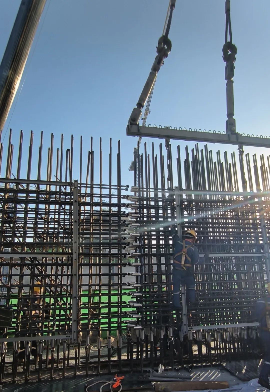 2022年10月11日,漳州核电2号机组核岛厂房直墙墙体连续两段钢筋笼于10点18分起吊,16点30分全部顺利吊装就位。单个重量分别为10吨和9.8吨,采用300T汽车吊进行吊装。