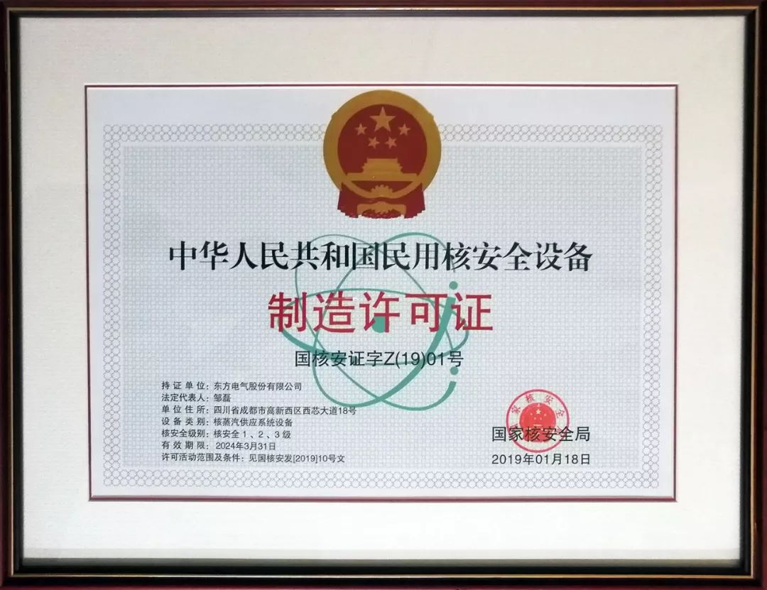 构建核电完整产业链,打造核电设备成套供货能力是东方电气人的矢志追求。2019年1月21日,国家核安全局向东方电气集团颁发了全国首张核蒸汽供应系统设备制造许可证,标志着东方电气集团成为国内首家具有核蒸汽供应系统设备成套供货资质的装备制造集团。至此,经过十年努力、五年试点,东方电气核蒸汽供应系统设备成套供货许可取证工作圆满完成。东方电气集团以此为新起点,充分发挥成套供货优势,严格遵守核安全法规,切实强化核安全文化意识,不断优化管理模式,持续设计制造能力和水平。