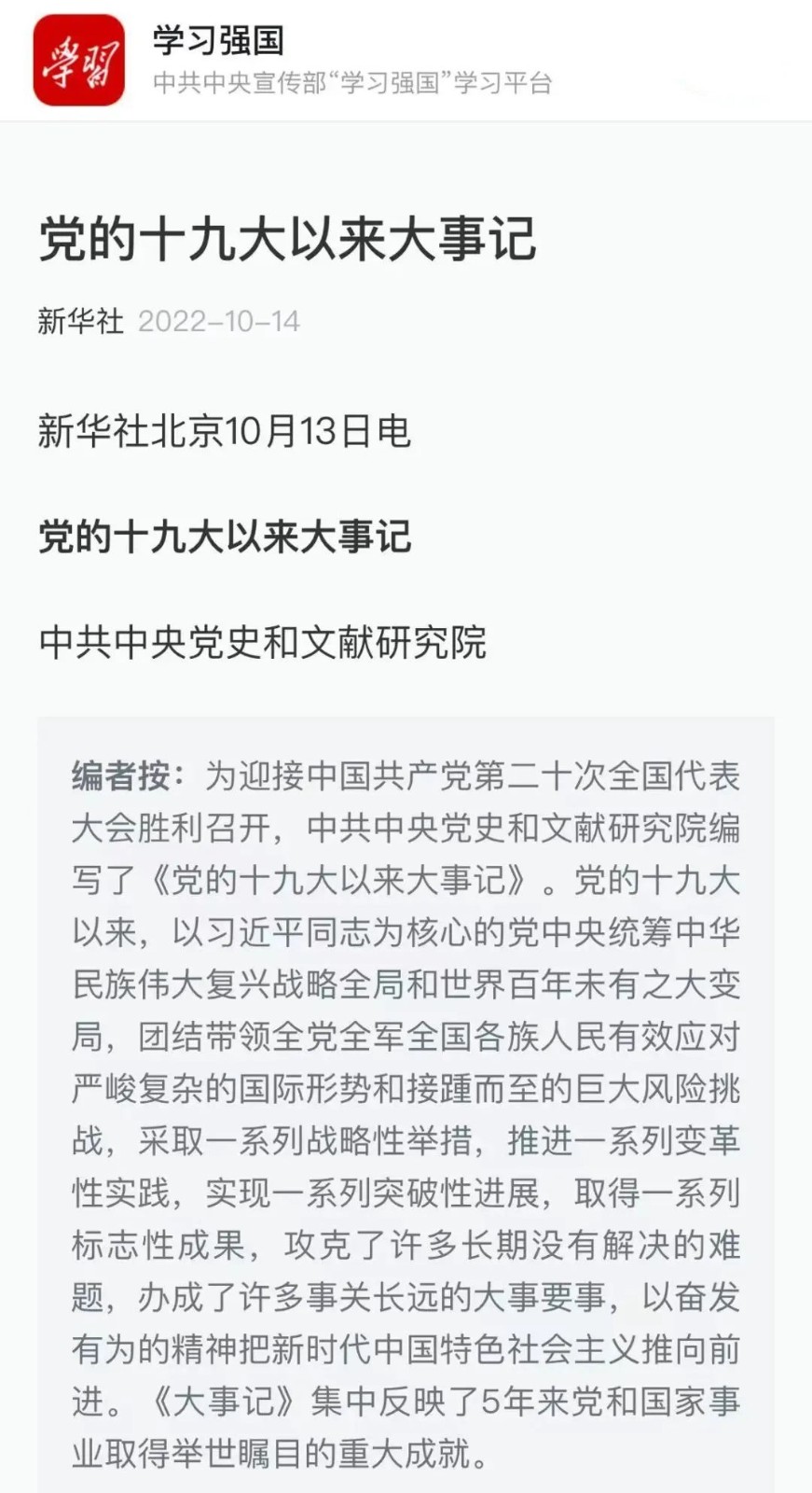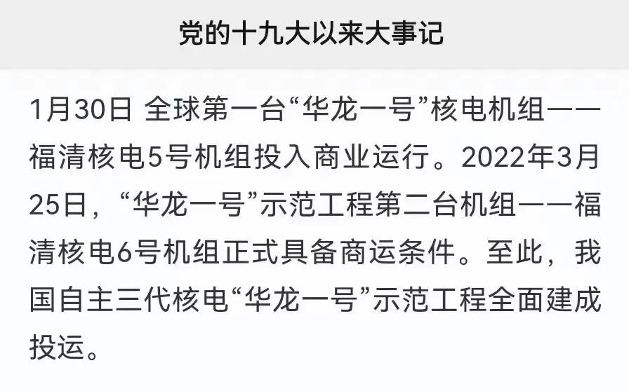 为迎接中国共产党第二十次全国代表大会胜利召开,中共中央党史和文献研究院编写了《党的十九大以来大事记》。“华龙一号”示范工程福清核电5、6号机组全面建成投运入选《党的十九大以来大事记》。