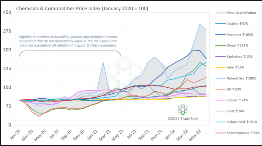 铀矿山生产所需原材料价格上涨情况(Quote: TradeTech)