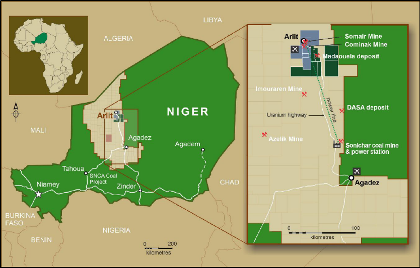 三季度铀矿生产开发方面的重要信息如下。哈原工宣布哈萨克斯坦2024年增产10%,在目前基础上上调2000-3000吨铀至25000-25500吨铀。乌兹别克斯坦计划将乌产量从2021年的3526吨铀逐步增长至2030年的7100吨铀。博斯能源推进澳大利亚蜜月铀矿(Honeymoon)融资和复产,计划2023年底复产,爬坡至满产1300-1400吨铀。帕拉丁公司宣布纳米比亚兰格海因里奇铀矿(LH)于2024年复产,爬坡至满产2000-2200吨铀,该项目中国铀业参股25%。全球原子公司推进尼日尔达萨铀矿(Dasa)融资和矿建,计划2025年初投产,爬坡至满产1300-1500吨铀。Goviex公司推进尼日尔马达乌埃拉铀矿(Madaouela)融资,计划2025年末投产,爬坡至满产1100吨铀。下图为尼日尔铀矿分布图。