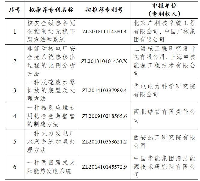 10月18日,国家能源局综合司公示能源领域第二十四届中国专利奖推荐项目,分别为《核安全级热备冗余控制站无扰下装方法和系统》《非能动核电厂安全壳系统热移出过程的比例分析方法》《一种脱硫废水零排放的装置及处理方法》《一种核反应堆专用锆合金薄壁管的制造方法》《一种火力发电厂水汽系统加氧处理方法》和《一种两回路式太阳能热发电系统》。