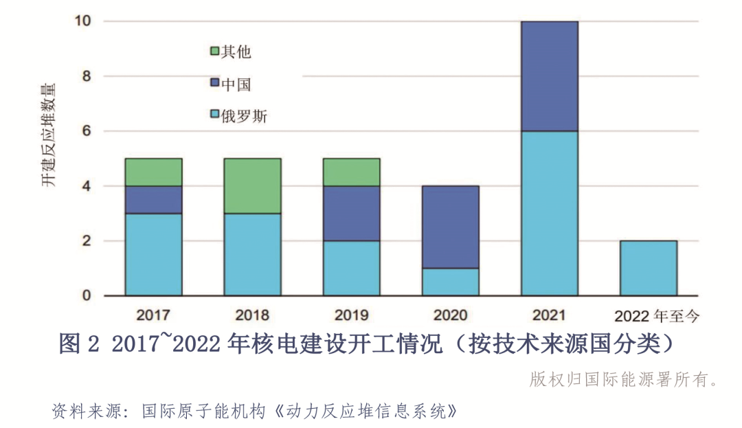 俄罗斯和中国开始占据市场主导地位。2017年后新建的反应堆共有31个,其中17个由俄罗斯设计,10个由中国设计,欧洲和韩国各占2个。俄罗斯在出口市场中占据主导地位,14台机组分别出口土耳其、印度、中国、孟加拉国和伊朗;中国设计的10台机组都由中国建造。但俄乌冲突或影响俄核电出口前景,如芬兰以延误风险增加为由取消了2013年与俄罗斯国家原子能公司签署的建厂合同。
