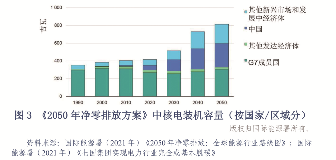 净零排放方案预测全球核电装机容量到2050年几乎翻番,从2022年初的413吉瓦增加到2050年812吉瓦,新建核电厂超过正逐步退役的现有核电厂数量。其中发达经济体核电增长态势强劲,新兴市场和发展中经济体的核电装机容量增长更快,约占全球增长量的90%;中国在核电装机容量上全球领先,预计将在2030年前超过美国和欧盟,到2050年拥有全球三分之一的核电设施。