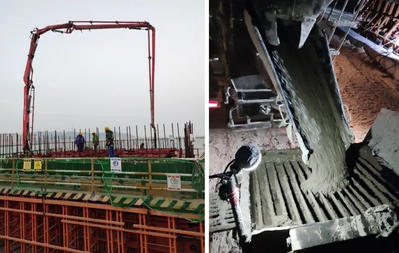 2021年12月31日,示范项目选择北护岸三段B-15沉箱作为铁铝酸盐水泥混凝土首次浇筑的永久构件,单件方量达574.52m³,混凝土强度等级为C40。首次浇筑一次性取得成功。