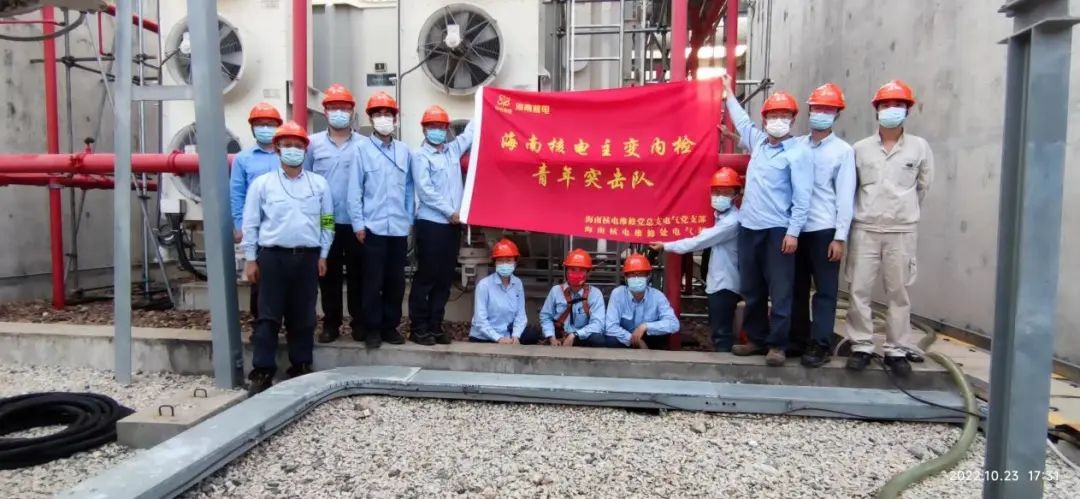 变压器内检为室外作业,10月海南的天气反复无常,为避免台风暴雨极端天气影响,工作组必须日夜连续开工,面对室外高压作业强度大、风险高的情况,团队成员上下同欲、勇毅前行,技术骨干带动年轻员工,以身作则、充分发挥党员先锋模范作用。