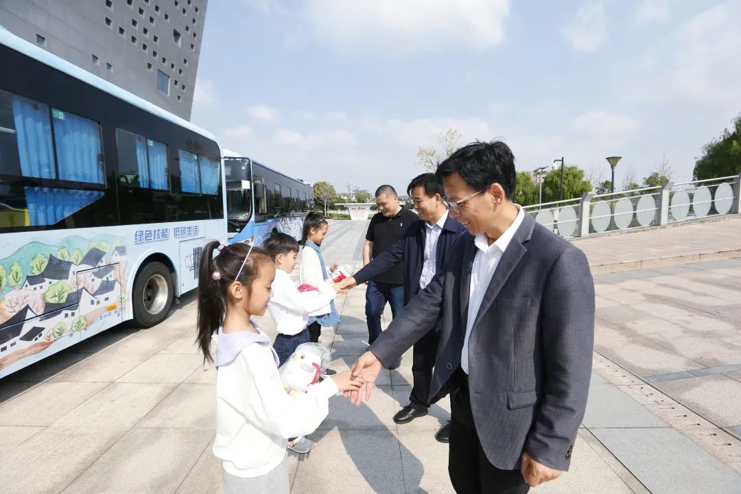 10月23日上午,在海盐2路公交车的起终点站——核电科技馆站,三位海盐学生开心地站在一辆涂满绿色核能创意画的2路公交车拍照留念。他们是首届“绿色核能 低碳生活”创意绘画比赛一等奖获得者。