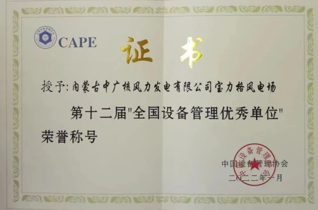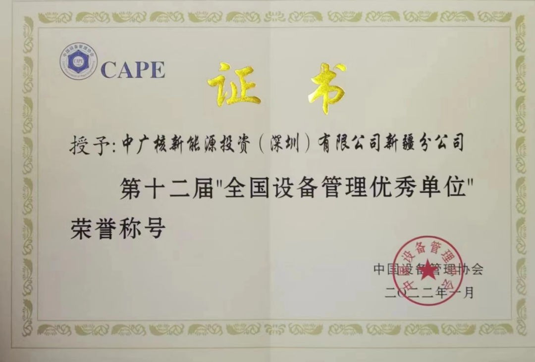 中广核新能源贵州、新疆、内蒙古三家分公司获颁第十二届“全国设备管理优秀单位”荣誉称号。