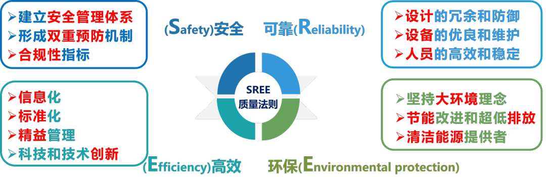 执行的问题要从流程设计层面去分析,流程的问题则需要上升到组织的理念文化维度去思考,通过更高维度的管理措施去解决低维度的管理问题。江苏核电将多年来质量领域的理念、文化、制度等方面的积累和沉淀,凝练打造为“安全、可靠、高效、环保”SREE质量法则,并作为企业经营中质量战略和质量文化的载体,引领各项质量管理活动开展。江苏核电将SREE质量法则定位为“约束和指引公司全员质量行为的总体认知”,并作为公司运营的重要目标和质量工作基础,以及公司每个人和每个过程都不可逾越的红线。
