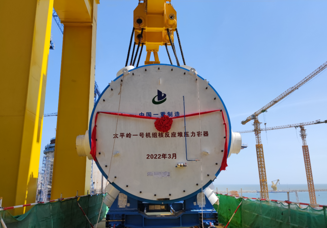 2022年10月26日上午10时,太平岭一期工程1号机组反应堆压力容器从1号机组临时龙门架区域0m吊运至+17.5m转运平台,标志着1号机组核岛主回路设备安装工作正式开始,较原计划提前近2个月时间,再创华龙高质量标杆。