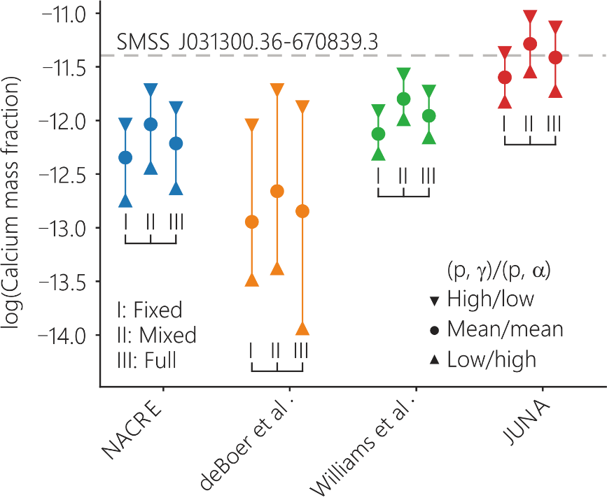 与此同时,该团队与天体物理学家合作研究了该反应率在第一代星中的影响,计算表明19F(p,γ)20Ne反应突破出去的概率比之前预想的要大7倍左右,导致生成例如钙类重物质的概率,比之前预计的要大很多,从而解释了最古老恒星中观测到的钙丰度问题。值得一提的是,在近期发射升空的JWST的关键科学目标之一,即是对宇宙中最古老的第一代星和星系的探测,目前已经观测到一批古老的恒星群。因此,本工作为研究JWST未来的观测结果提供了可靠的核物理输入量。