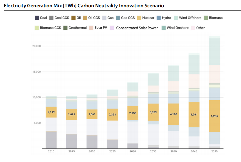 在碳中和情景中,2050年欧经会地区核电装机容量将在现有基础上翻番,达到6.04亿千瓦;发电量4.4万亿千瓦时,占总发电量(22.1万亿千瓦时)的约20%。在碳中和创新情景中,大型核反应堆和模块化小堆均得到大规模部署;2050年欧经会地区核电装机容量将达8.74亿千瓦(其中4.5亿千瓦是模块化小堆装机容量);核发电量6.235万亿千瓦时,占总发电量的近30%。