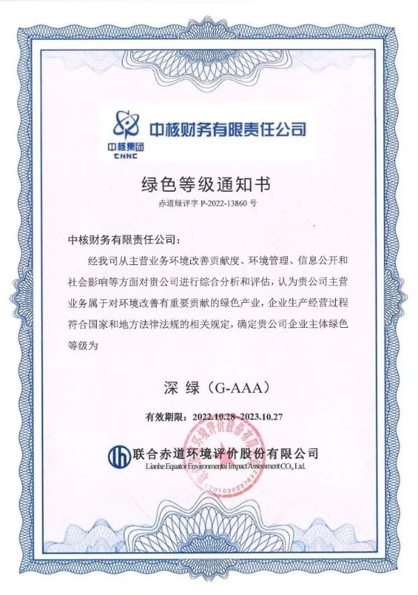 近日,经联合赤道环境评价股份有限公司评估,认定中核财务公司属于对环境改善有重要贡献的绿色企业,确定公司获得绿色企业最高等级“深绿G-AAA”主体认证。联合赤道环境评价股份有限公司是国内权威的绿色金融评估认证机构,也是国内最大的信用信息服务机构之一。