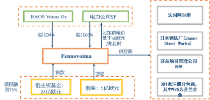 项目公司Fennovoima的股权结构中,电力公司SF占股66%,ROSATOM股权由分公司RAOS Voima Oy持有,占股34%。Hanhikivi核电项目的建设成本预计为60亿~70亿欧元,股权投资占25%,债务融资占75%,债务融资由ROSATOM负责安排,项目投融资结构如图所示,符合芬兰政府提出芬兰企业(或在欧盟注册企业或欧洲自由贸易协会成员)股比和不低于60%的要求。
