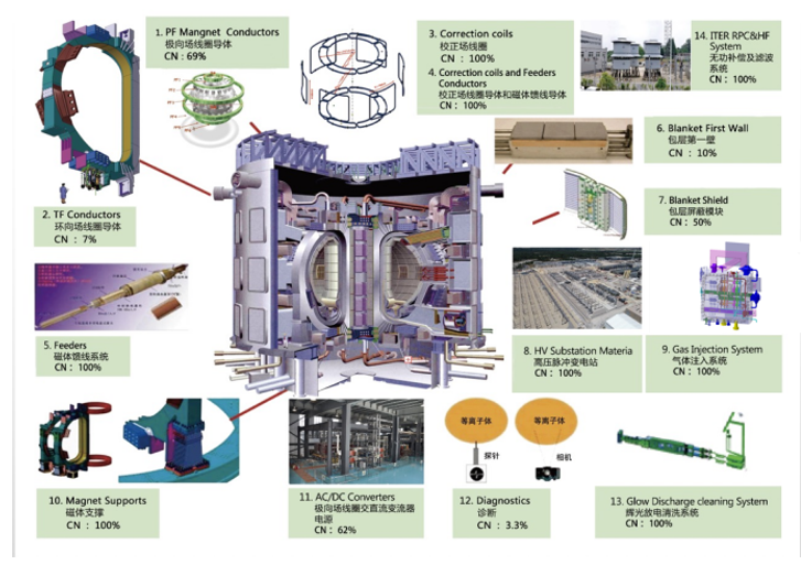 根据ITER七方共识文件及相关修订,中方主要负责18个采购包的实物贡献:磁体支撑、校正场线圈、馈线接口、环向场导体、极向场导体、校正场线圈和馈线导体、第一壁、屏蔽包层、气体注入、辉光放电清洗系统、诊断(赤道面7号和其余中子通量监测器、朗缪尔探针、径向X射线相机、赤道面12号窗口集成)和脉冲高压变电站、极向场变流器电源系统、无功补偿和滤波系统。在建造阶段,中国承担了ITER装置9%的采购包制造任务,界定为实物贡献。中方还提供现金贡献,推荐并派遣人员赴组织总部工作。中方实物贡献约占中方贡献额的80%,现金贡献约占20%。