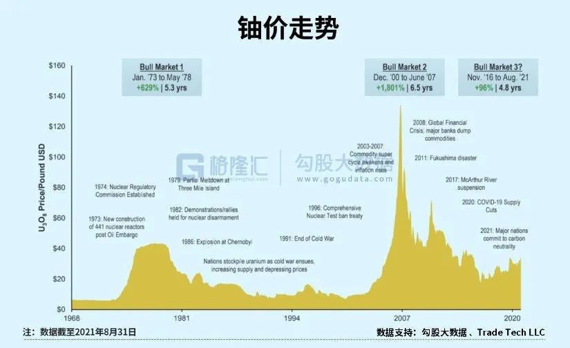 70年代,是核能的黄金时代,铀矿与其它大宗商品共同经历了一轮大牛市,直到1986年被切尔诺贝利事故打翻,“核牛”才进入熊市。