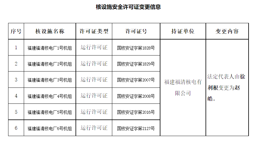 根据《中华人民共和国核安全法》《核动力厂、研究堆、核燃料循环设施安全许可程序规定》的有关要求,我局对你公司提交的关于福建福清核电厂1-6号机组运行许可证法定代表人信息变更的申请进行了审查,认为相关信息的变更符合核设施安全许可证变更的程序要求,现予确认。