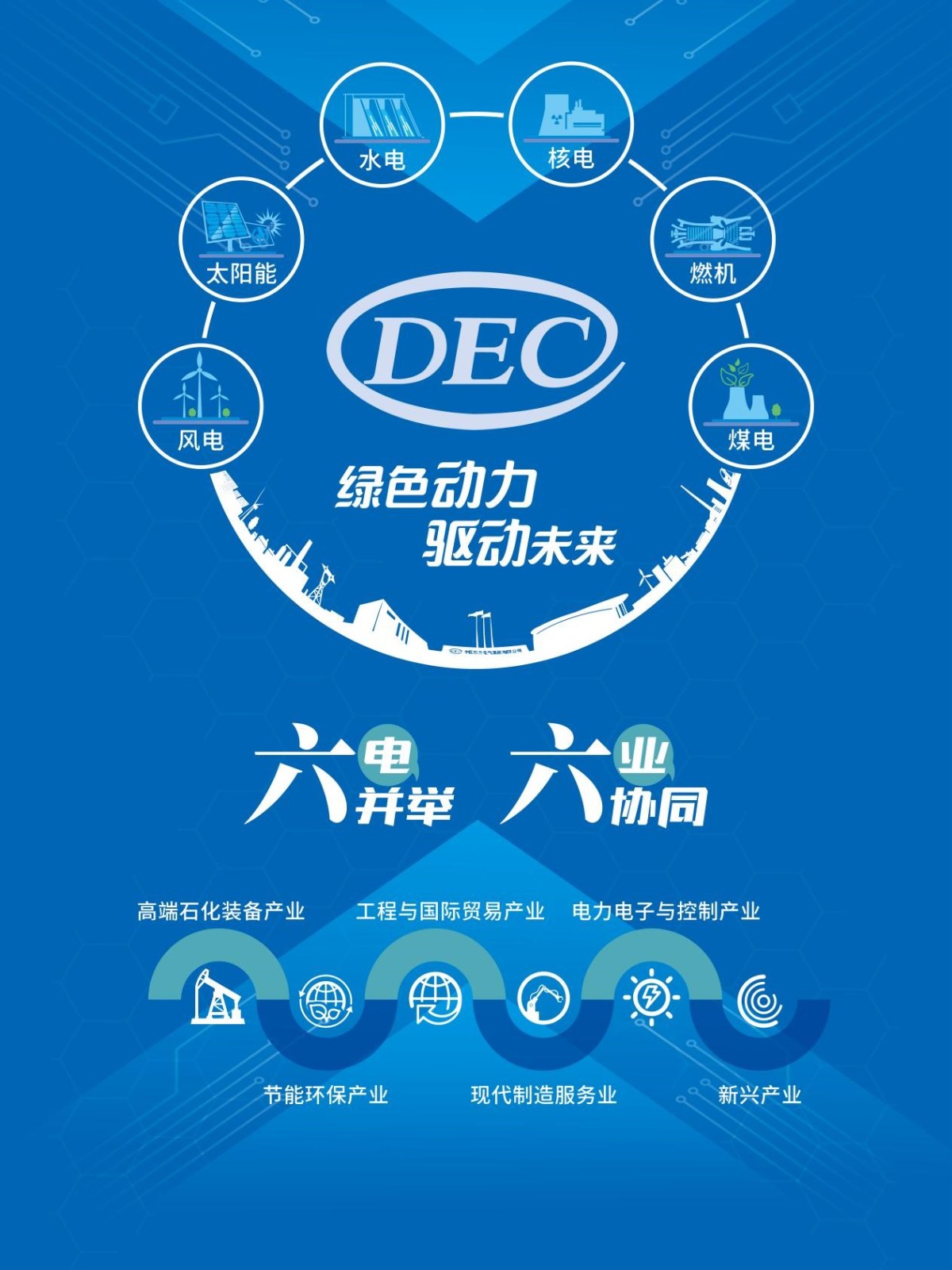 东方电气是中国电力驱动时代的先驱者之一,成长于三线建设,发展于改革开放,壮大于新的时代,孕育了“东汽精神”,始终牢记习近平总书记殷殷嘱托,不忘产业报国初心,牢记制造强国使命,以“绿色动力、驱动未来”为己任,坚持科技自立自强,完整、准确、全面贯彻新发展理念,瞄准碳达峰、碳中和目标,大力实施“11256”发展战略,加快推进“绿色智造”转型,形成了“六电并举、六业协同”的产业格局[“六电”:风电、太阳能、水电、核电、燃机、煤电;“六业”:高端石化装备产业、节能环保产业、工程与国际贸易产业、现代制造服务业、电力电子与控制产业、新兴产业],产品包括风电机组、太阳能发电设备、水电机组、核电机组、火电机组(燃气轮机发电、清洁高效煤电)、控制系统、环保设备、工业化工装备、氢能及燃料电池、储能装备、新材料等,致力于为客户提供能源装备、绿色低碳装备、高端智能装备于一体的综合能源解决方案。