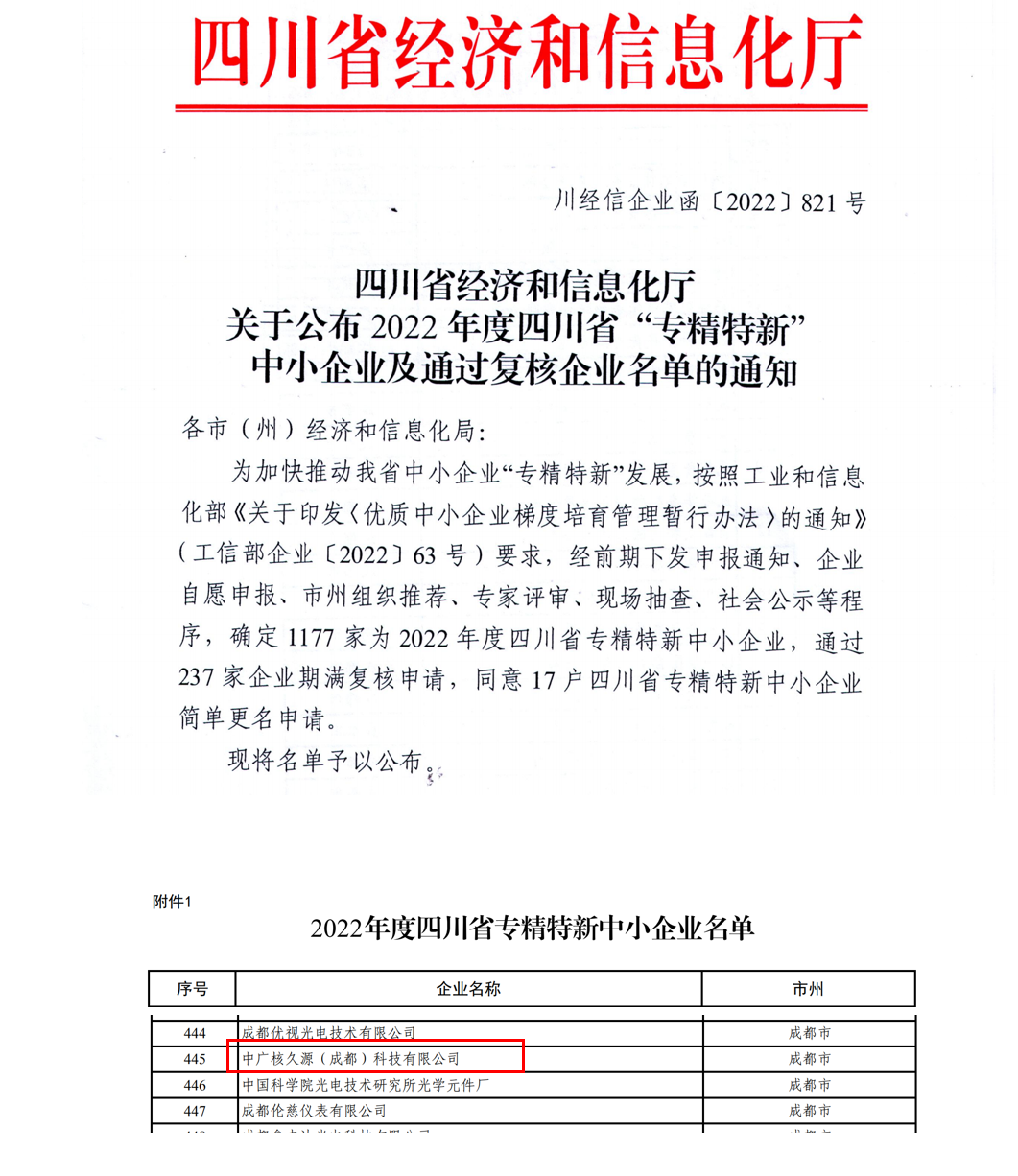 近日,四川省经济和信息化厅发布《关于2022年度四川省“专精特新”中小企业及通过复核企业名单的通知》,中广核技受托管理的中广核久源(成都)科技有限公司(以下简称:久源公司)顺利通过2022年度四川省“专精特新”中小企业认定。至此,中广核技共有8家下属公司(含托管公司)获得国家、省市级“专精特新”企业认定,其中3家为国家级专精特新“小巨人”企业。