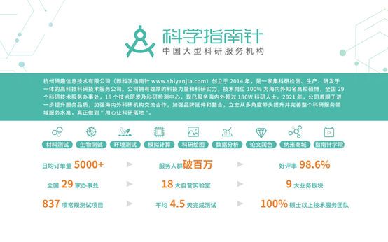 杭州研趣信息技术有限公司(科学指南针)于2014年注册成立,曾获得由经纬中国独家投资的数千万元A轮融资。自成立以来深耕理工类专业科研服务需求,包括不限于材料、生物与环境检测服务,模拟计算、科研绘图、论文润色,数据分析,未知成分分析,耗材试剂等领域,坚持打磨核心技术与服务能力,立足中国,服务全球。