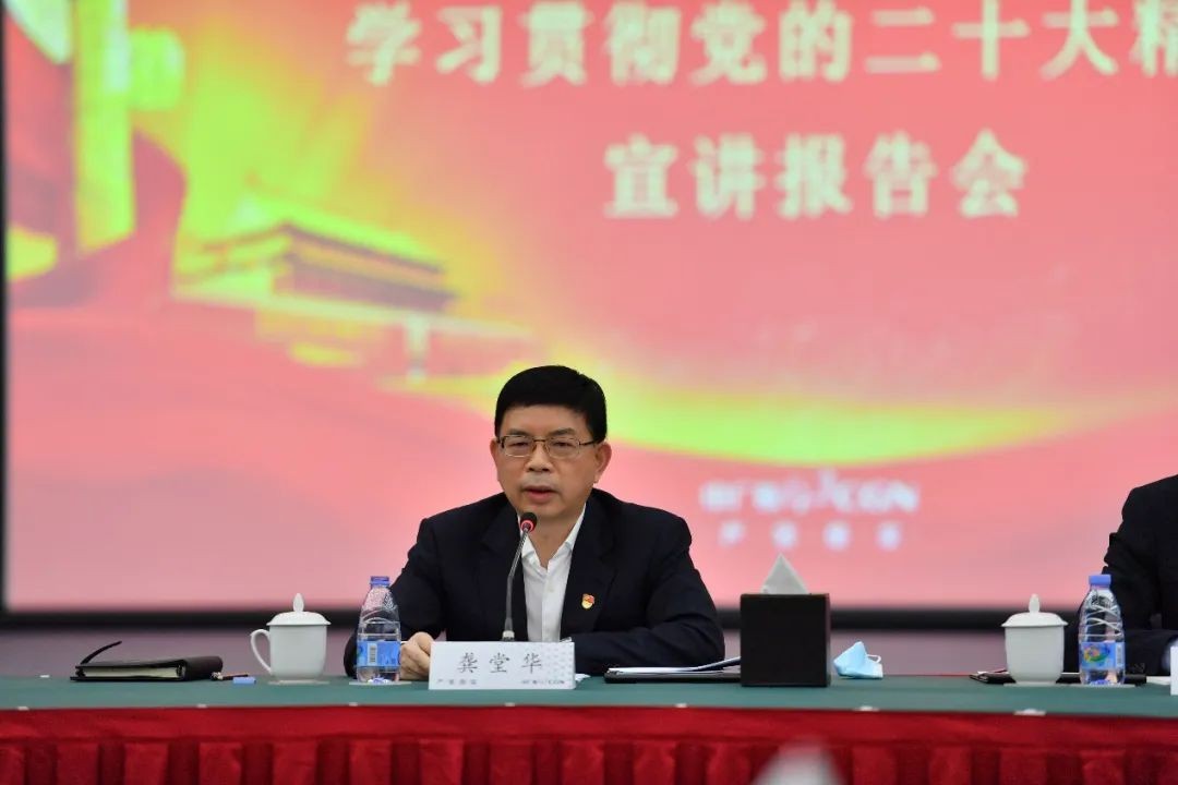 宣讲会上,龚堂华指出,党的二十大是在全党全国各族人民迈上全面建设社会主义现代化国家新征程、向第二个百年奋斗目标进军的关键时刻召开的一次十分重要的大会,是一次高举旗帜、凝聚力量、团结奋进的大会。习近平总书记的报告,深刻阐释了新时代坚持和发展中国特色社会主义的一系列重大理论和实践问题,描绘了全面建设社会主义现代化国家、全面推进中华民族伟大复兴的宏伟蓝图,为新时代新征程党和国家事业发展、实现第二个百年奋斗目标指明了前进方向、确立了行动指南,是党和人民智慧的结晶,是党团结带领全国各族人民夺取中国特色社会主义新胜利的政治宣言和行动纲领,是马克思主义的纲领性文献。