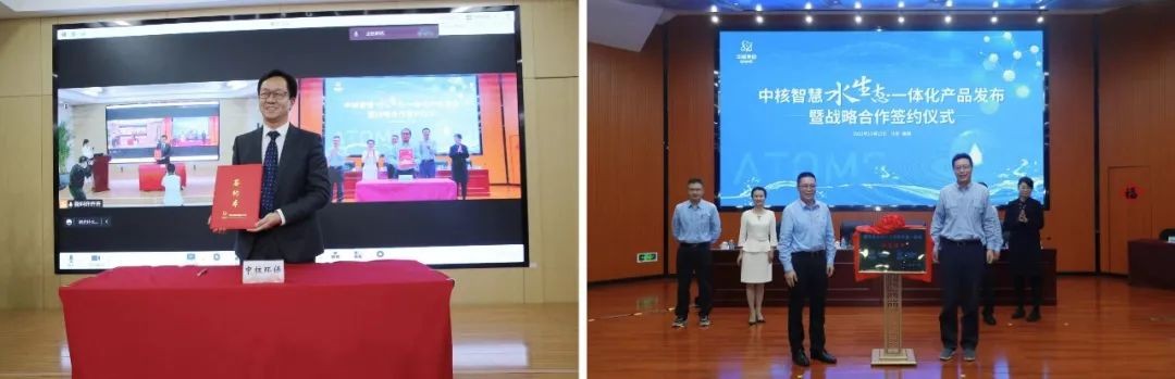 发布会上,国内首个智慧水生态示范项目签约落地华龙一号全球首堆所在地福清核电,中核环保、福清核电负责人在线举行了示范项目揭牌仪式。