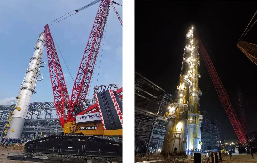 2022年11月16日中核机械工程圆满完成大连恒力石化项目苯二塔设备吊装,历时2小时6分钟。自11月11日起,中核机械工程使用1000吨履带式起重机作为主起重机,650吨履带式起重机配合溜尾,高效完成两台大件设备吊装,现场安全可控。两台大件设备苯一塔、苯二塔吊装总重量约686吨。