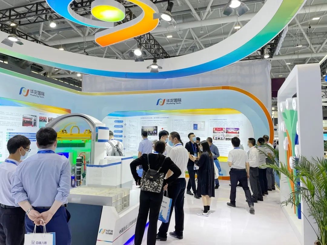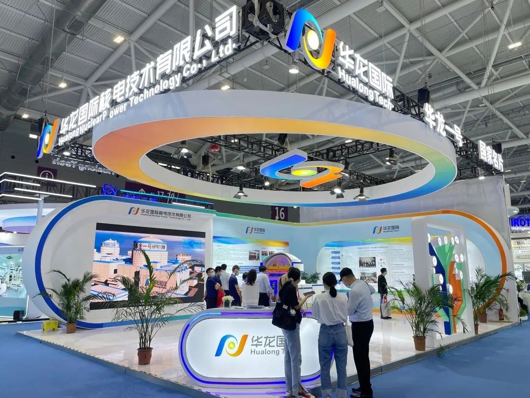 华龙国际展台设计充分运用公司“蓝+橙”的主题色彩,整个展台以华龙技术持续改进与优化创新工作为主线徐徐展开,通过丰富的展板内容,对公司概况、企业定位、业务范围、核心能力及使命愿景进行了详细介绍。利用展台中心位置的华龙一号模型,生动、形象地展示了华龙一号的主要技术特征和安全设计理念,结合华龙技术发展路线图,总结归纳华龙一号在“十二五”“十三五”的发展历程,并阐述“十四五”“十五五”华龙技术的发展方向与目标。同时,展台还展示了华龙国际近年来在国家能源局、国家核安全局、中核集团、中国广核集团等上级单位的大力支持和关心下,在发挥桥梁与平台作用,助力核能行业高质量发展过程中取得的诸多实绩和重要突破,并通过项目分布图的形式,全面展示了国内外华龙一号项目的最新进展情况,相关内容在展会期间吸引了大量观众驻足观看。