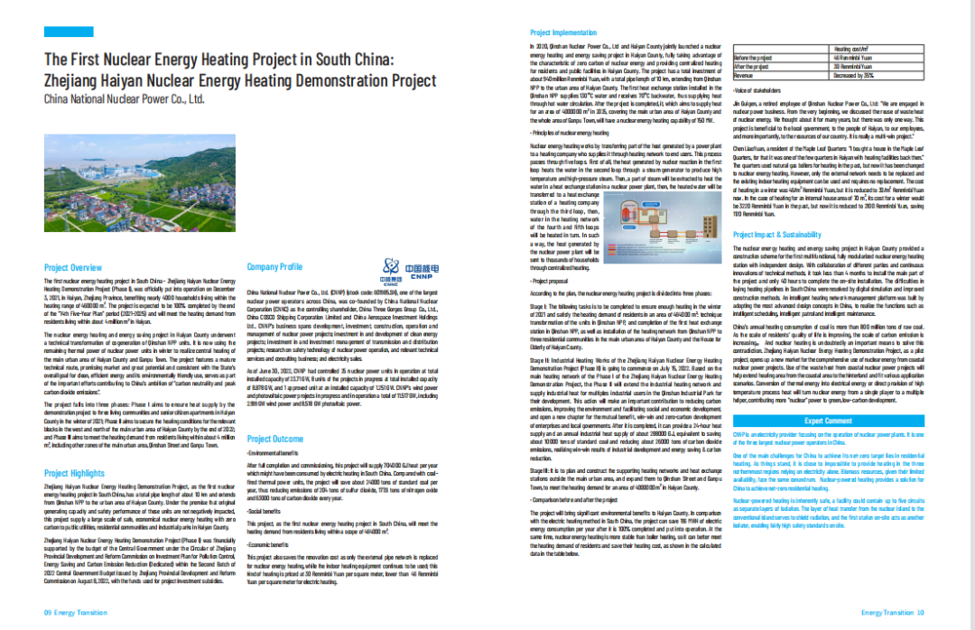 浙江海盐核能供热示范工程为中国南方地区首个核能供热项目,管道总长度约10公里,从秦山核电基地厂内延伸至海盐县城区,在不影响机组原有发电量和安全性能的前提下,向海盐县公建设施、居民小区及工业园区提供大规模安全、零碳、经济的核能供暖。