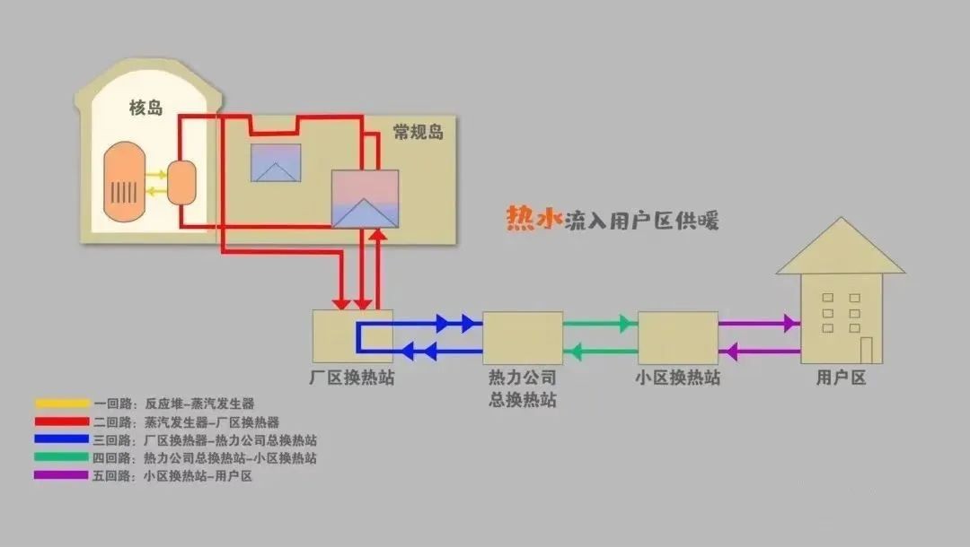 核能供暖的原理是将核电厂产生的部分热量传递给热力公司,再经过供热管网送至终端用户。这个过程由五个回路完成,首先一回路核反应产生的热量通过蒸汽发生器将二回路的水加热产生高温高压蒸汽,通过抽取部分蒸汽加热核电厂内换热站的水,加热后的水经过三回路管网,传送至热力公司换热站,依次加热四、五回路供热管网内的水,从而实现将核电厂产生的热量,安全地送入千家万户进行集中供暖的目的。