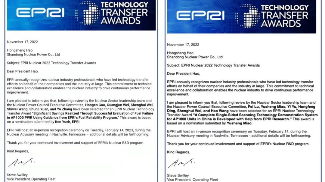 近日,山东核电提报的《对奥氏体不锈钢管道焊缝单侧扫查及以风险为导向的管道焊缝十年在役检查计划制定的技术应用》以及《AP1000核电厂燃料可靠性监督及失效评价》2项技术创新成果从全球超400台机组中脱颖而出,在美国电力研究协会(EPRI)核电板块技术成果转化奖评选中获奖,这也是集团公司在去年首次获奖后连续第二年获此殊荣。