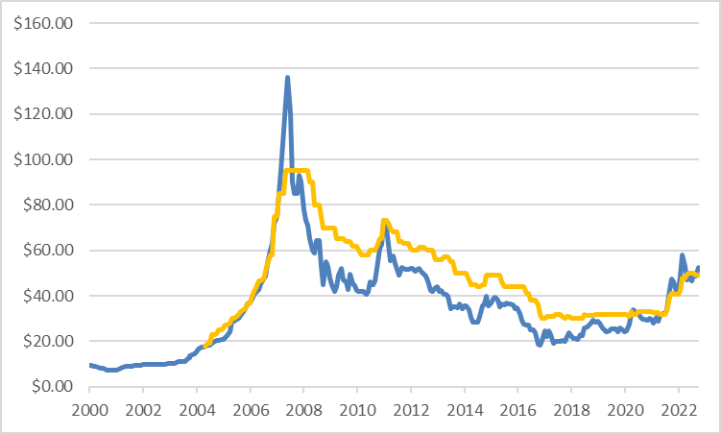 2020-2022年月末现货铀价和长贸铀价