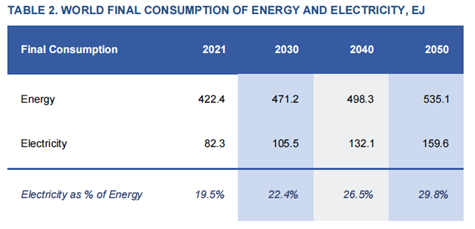 全球总发电量将从2021年的27万亿千瓦时增至2030年33.3万亿千瓦时、2040年41.5万亿千瓦时和2050年50.1万亿千瓦时。