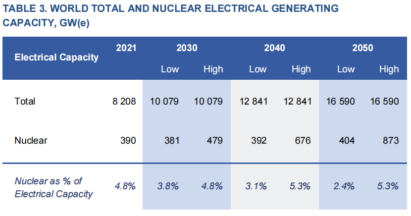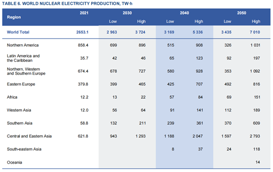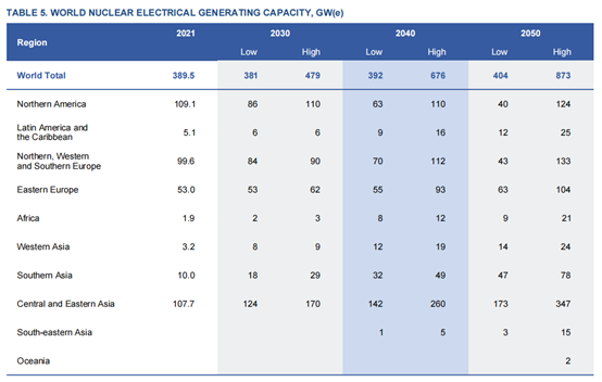 2022年9月26日,国际原子能机构(IAEA)发布2022年版年度报告《直至2050年能源、电力和核电预测》。这是该系列的第42版预测报告,概述了截至2021年底国际原子能机构各成员国的核电发展状况,并根据国际能源署(IEA)《2021年世界能源展望》和美国能源信息管理局(EIA)《2021年国际能源展望》等研究报告,对全球以及各地区直至2050年的能源、电力和核电发展情况进行了预测。