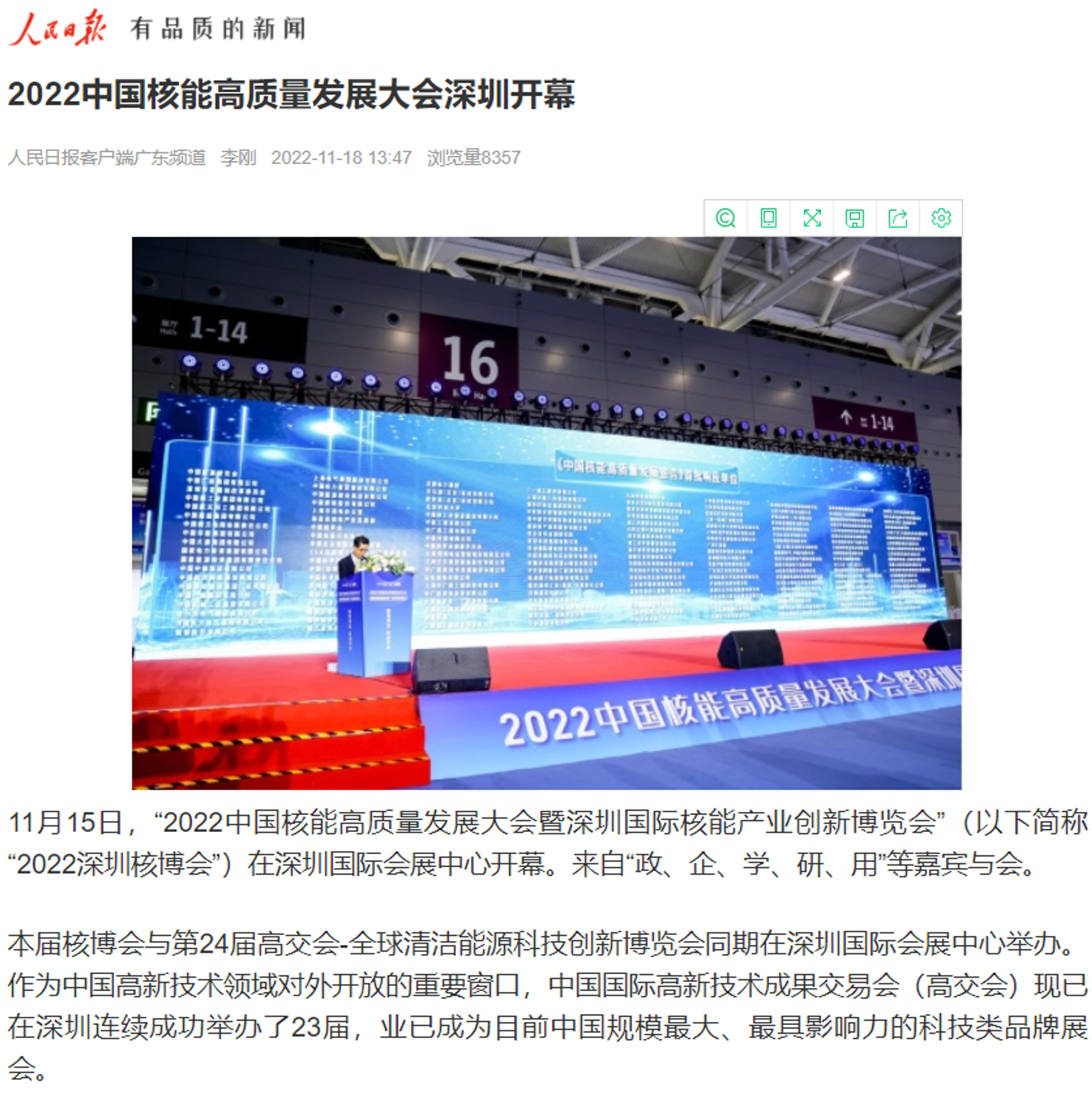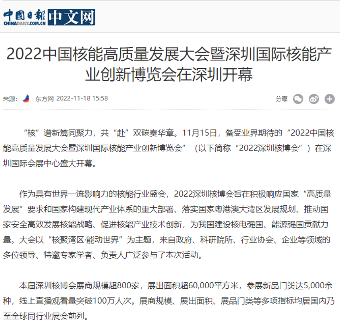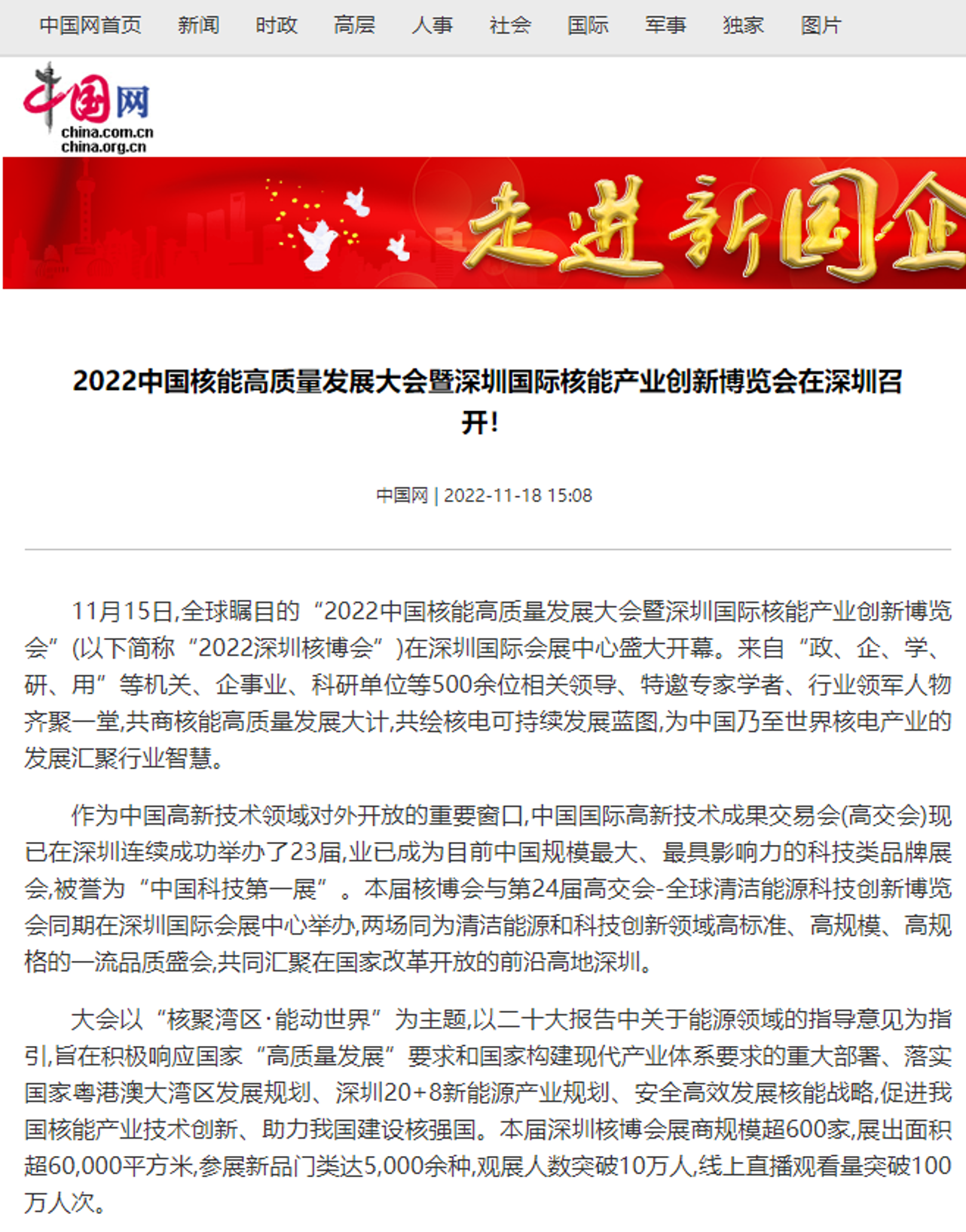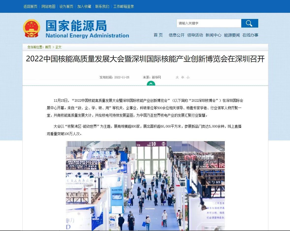 会后,国家能源局官网报道和宣传了本届深圳核博会的盛况,并予以高度评价。