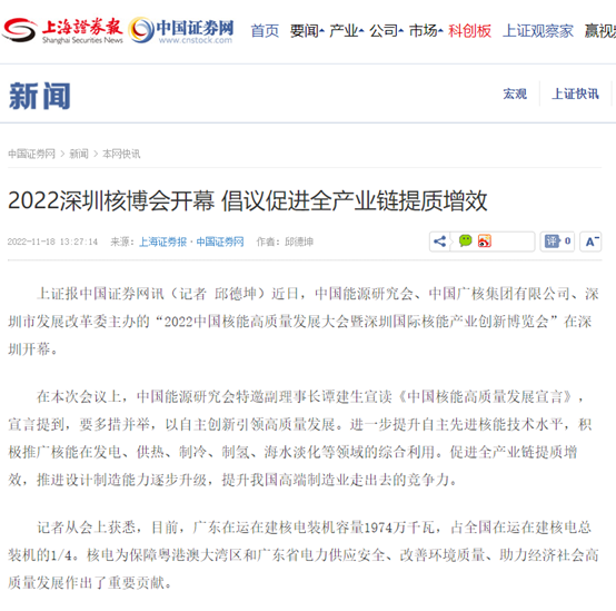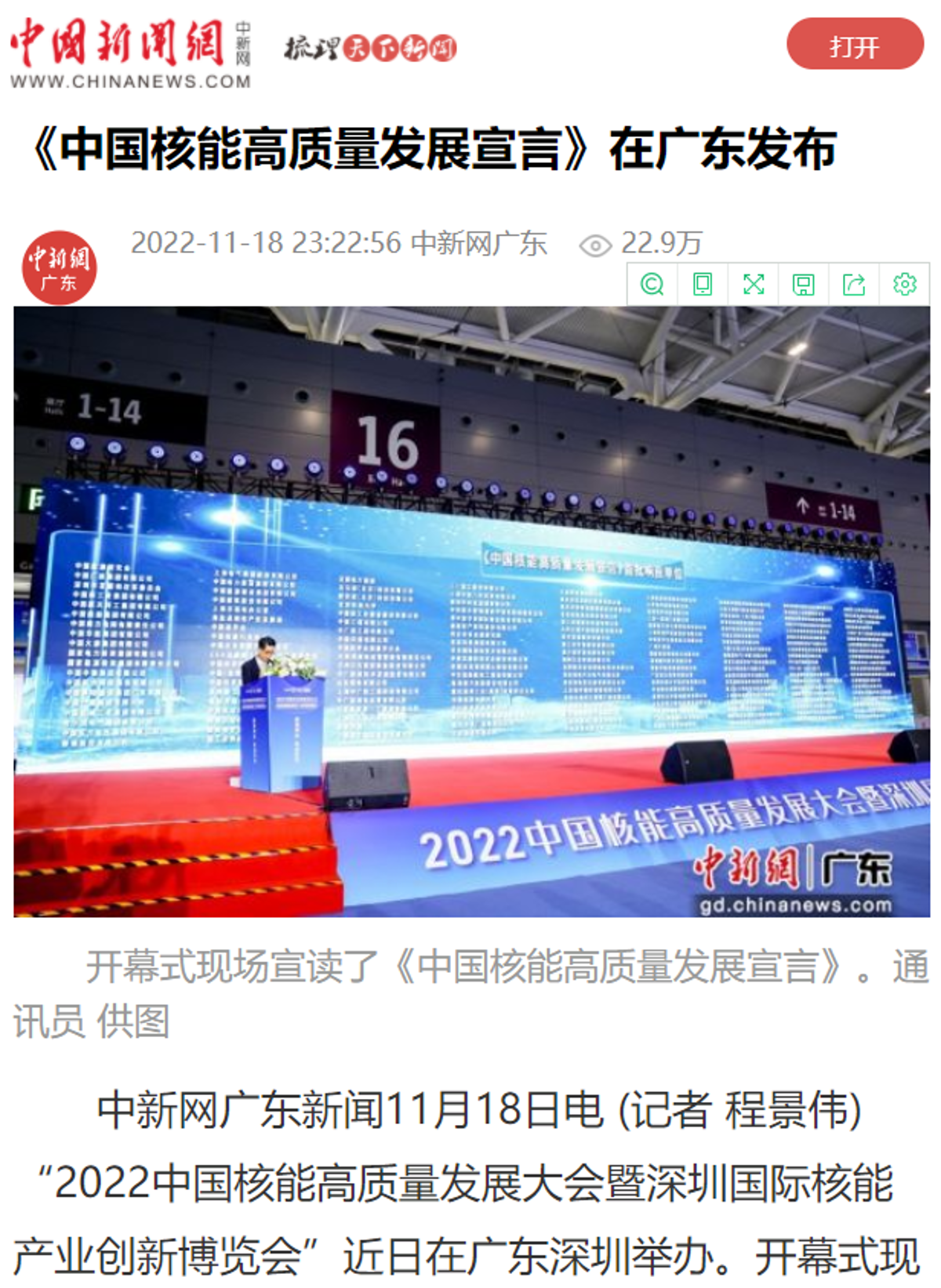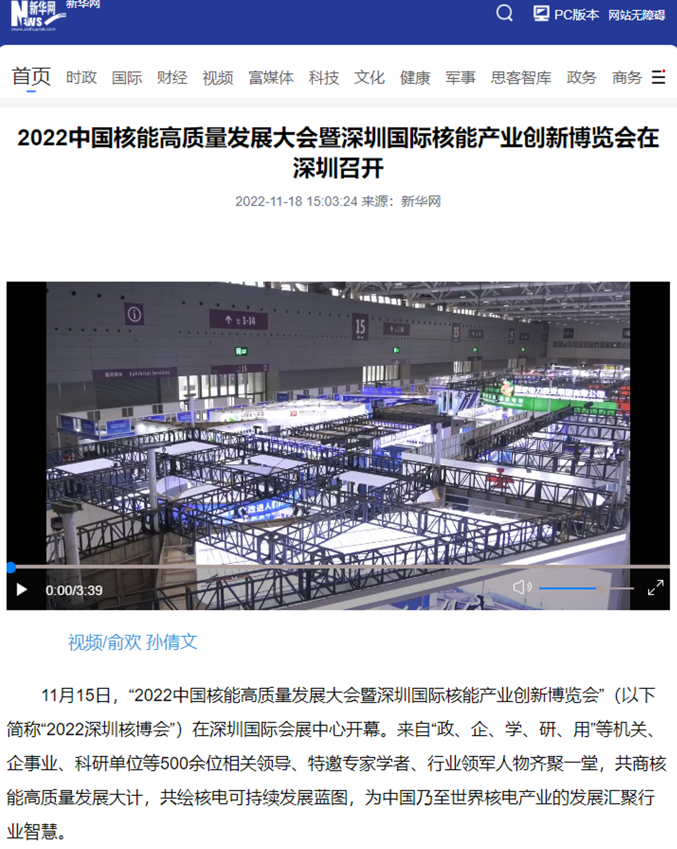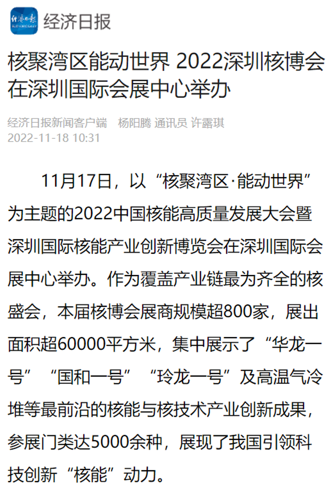 会后,国家能源局官网报道和宣传了本届深圳核博会的盛况,并予以高度评价。