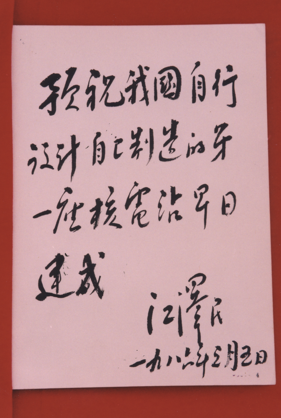 2004年8月31日,江泽民同志在中国人民革命军事博物馆参观“中国核事业50年成就展”时强调,“实践证明,党中央做出发展核事业的战略决策是十分正确的,我国核事业队伍是一支具有光荣传统和创新能力的队伍。”