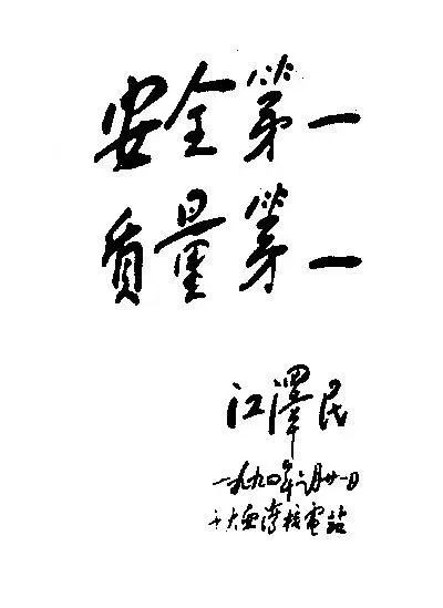 1990年6月21日,江泽民同志视察广东大亚湾核电站工地现场,发表重要讲话,并题词 “安全第一,质量第一”。